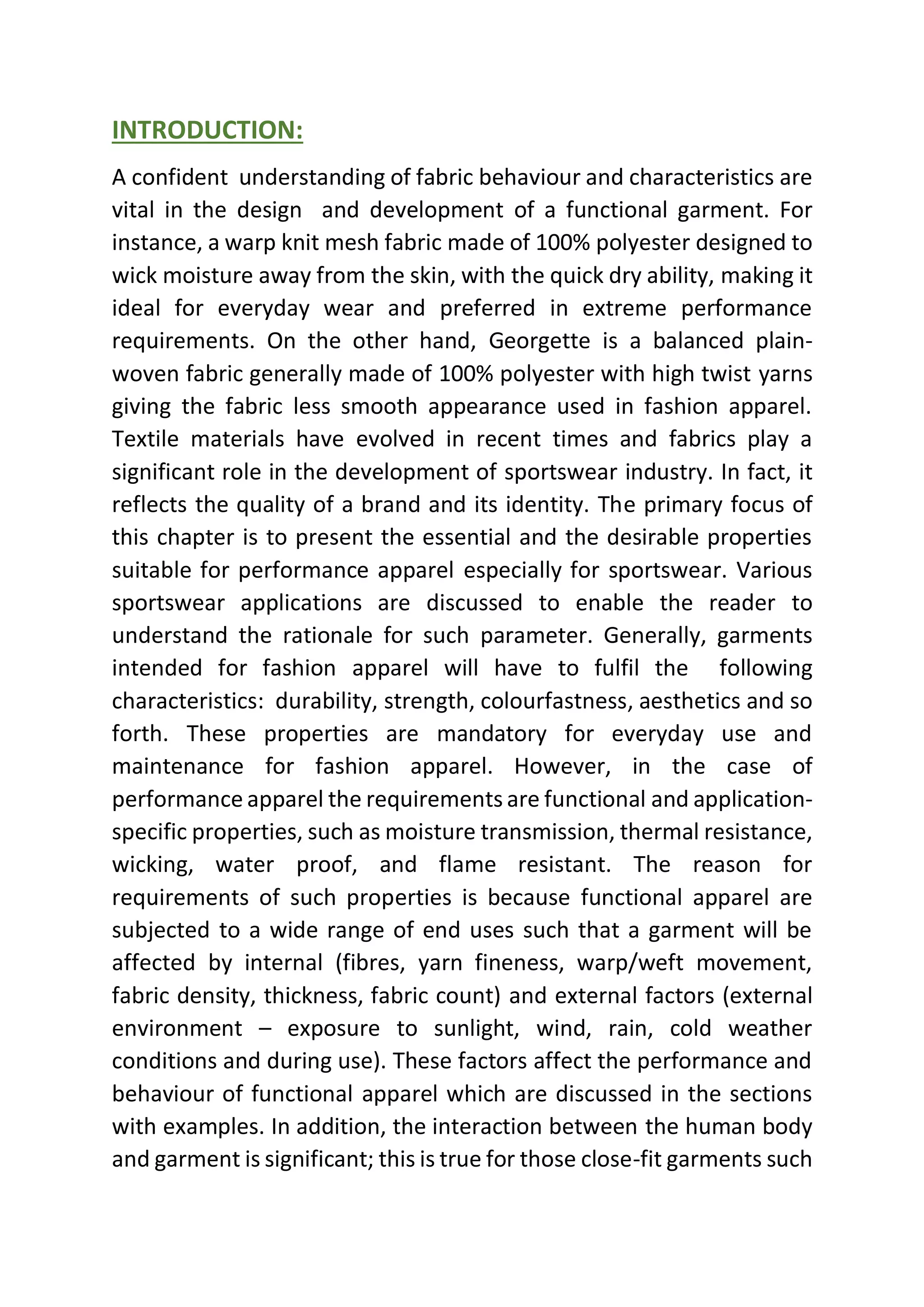 This document provides an overview of different types of fabrics, their properties, and practical examples. It discusses woven fabrics like poplin, muslin, georgette, gauze, satin, velvet, flannel, drill, terry, and denim. For each fabric, it describes the construction method, properties like weight, texture, durability, and common uses. Practical examples are given for using woven fabrics, such as making curtains from poplin or upholstering furniture with velvet. The document aims to explain the characteristics and applications of various performance fabrics.