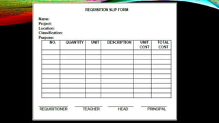 This document discusses the use of different forms for electrical work, including inventory, purchase requisition, job order, and borrower forms. It provides examples of situations where an electrician would need to use each form, such as using a borrower's form to request tools for a job installing outlets and switches. The document also emphasizes the importance of using the appropriate form and accurately filling it out for electrical tasks.