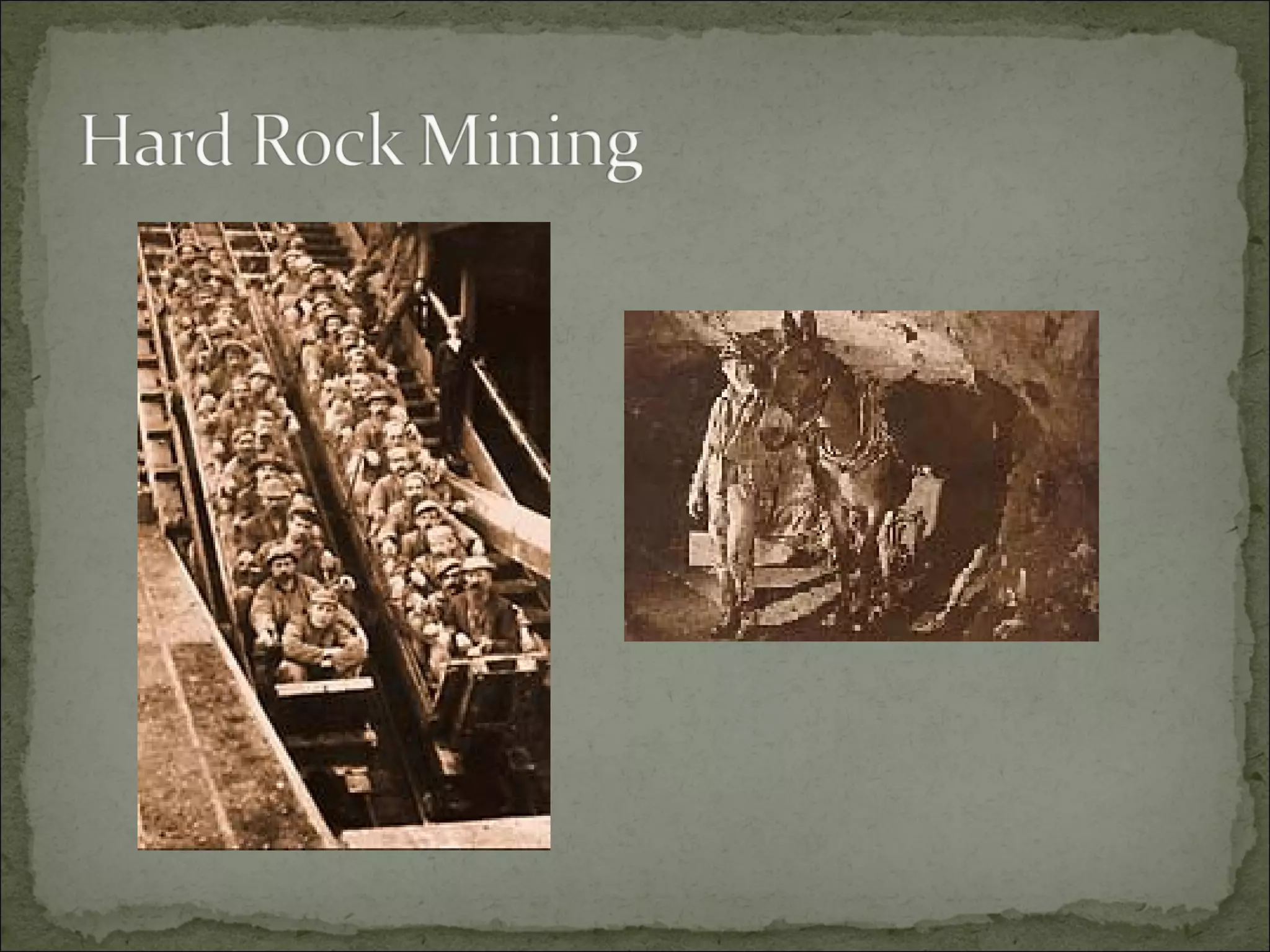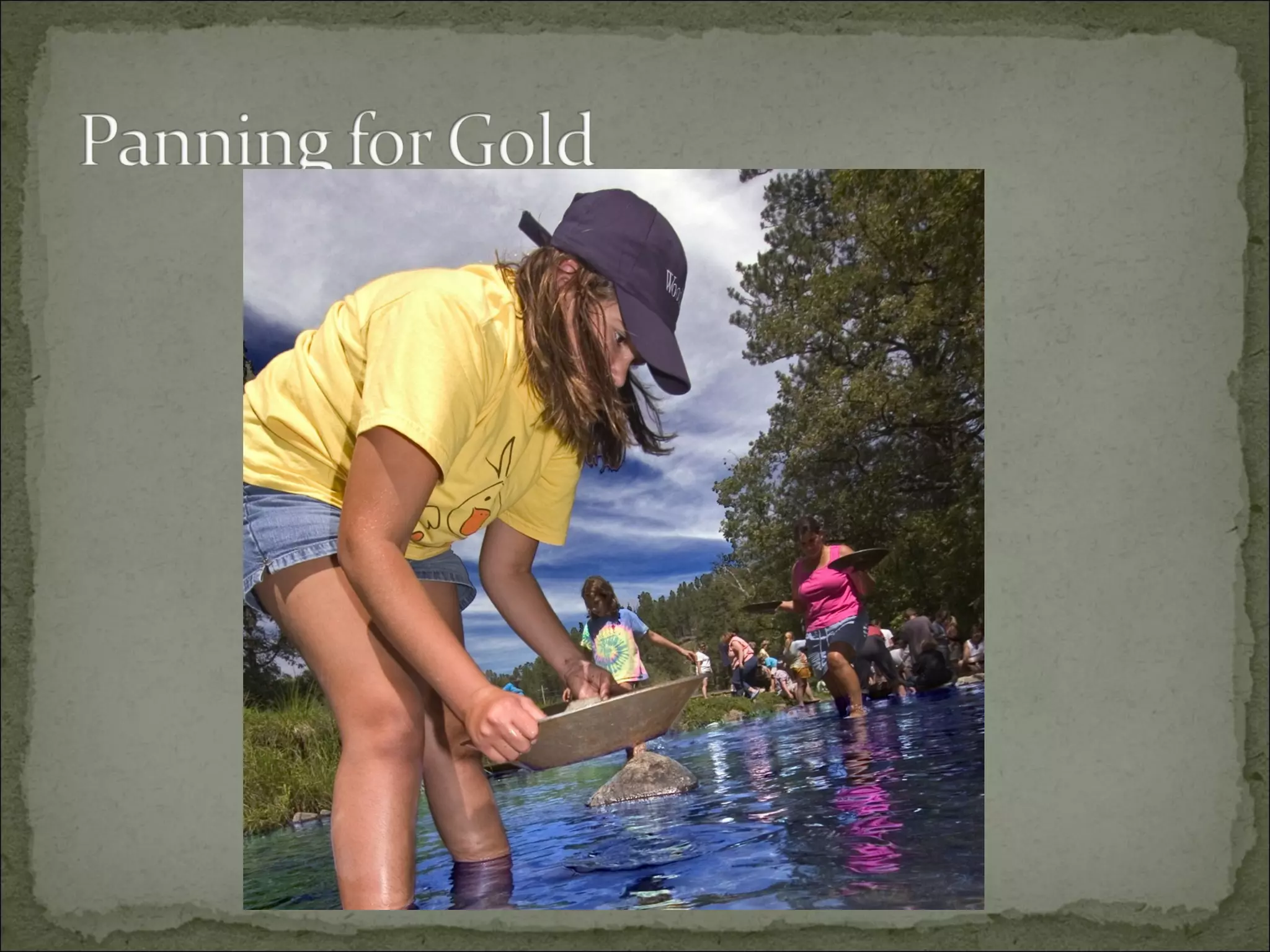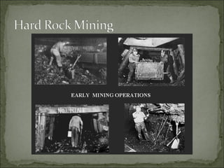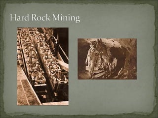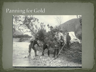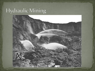 This document describes gold mining techniques from the past. Miners would extract rocks and materials from deep underground using horses or mules, and later use powerful water cannons to break rocks off cliffs and wash gold-containing material downstream. Individual miners would then spend time panning for gold by swirling water, rocks, and sand in pans to have the heavier gold sink to the bottom.