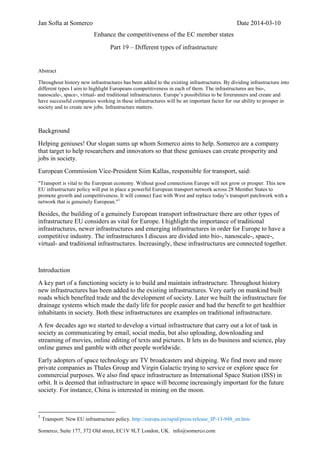 The document discusses various types of infrastructures essential for enhancing Europe's competitiveness, including bio-, nanoscale-, space-, virtual-, and traditional infrastructures. It highlights the importance of maintaining and developing these infrastructures to foster innovation, create jobs, and support economic growth. Notably, the text emphasizes the role of emerging technologies in shaping future infrastructure and the necessity of including SMEs in the evolving European space economy.