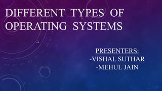 This document provides an overview of different types of operating systems, including Windows OS, Mac OS, Linux, DOS, and Unix. It discusses the history and key features of each operating system, as well as their advantages and disadvantages. The document focuses on explaining the user interface, applications, and versions of different operating systems like Windows, highlighting Windows XP, Vista, and 10. It also summarizes the origins and uses of Linux, Mac OS, DOS, and Unix operating systems.