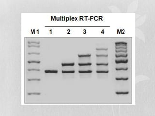 This document discusses different types of polymerase chain reaction (PCR) techniques. It begins by providing background on PCR and its development. It then describes several types of PCR including multiplex PCR, which allows for simultaneous detection of multiple pathogens; nested PCR, which increases specificity; reverse transcription PCR (RT-PCR) and quantitative real-time PCR (qRT-PCR), which are used to detect RNA; quantitative PCR, which measures specific target DNA/RNA amounts; and other variants like hot-start PCR, touchdown PCR, and methylation-specific PCR. Each type is briefly explained along with its uses and applications in medical research.
