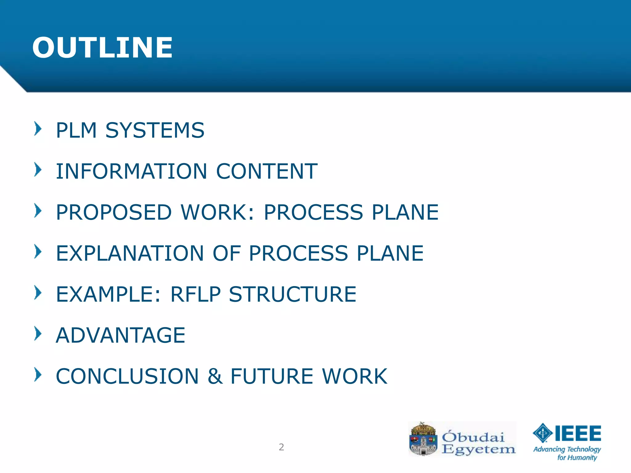 The document discusses the various processes involved in the Product Lifecycle Management (PLM) information content model, highlighting the analysis process, effect process, and optimization process. It introduces the RFLP structure as a new method for product definition, emphasizing its ability to manage engineering objects more effectively. The conclusion suggests the need for extending theoretical insights into practical applications while exploring the integration of fuzzy concepts for decision-making.