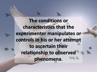 The document defines key terms used in educational research, including independent variables, dependent variables, treatment variables, organismic variables, attribute variables, intervening variables, and extraneous variables. Independent variables are the conditions manipulated or observed by the researcher, such as a teaching method. Dependent variables are the conditions that change as a result of changes to the independent variable, like test scores. Treatment and organismic variables are types of independent variables. Intervening variables are difficult to observe individual feelings like boredom, while extraneous variables are more readily observed and controlled conditions.