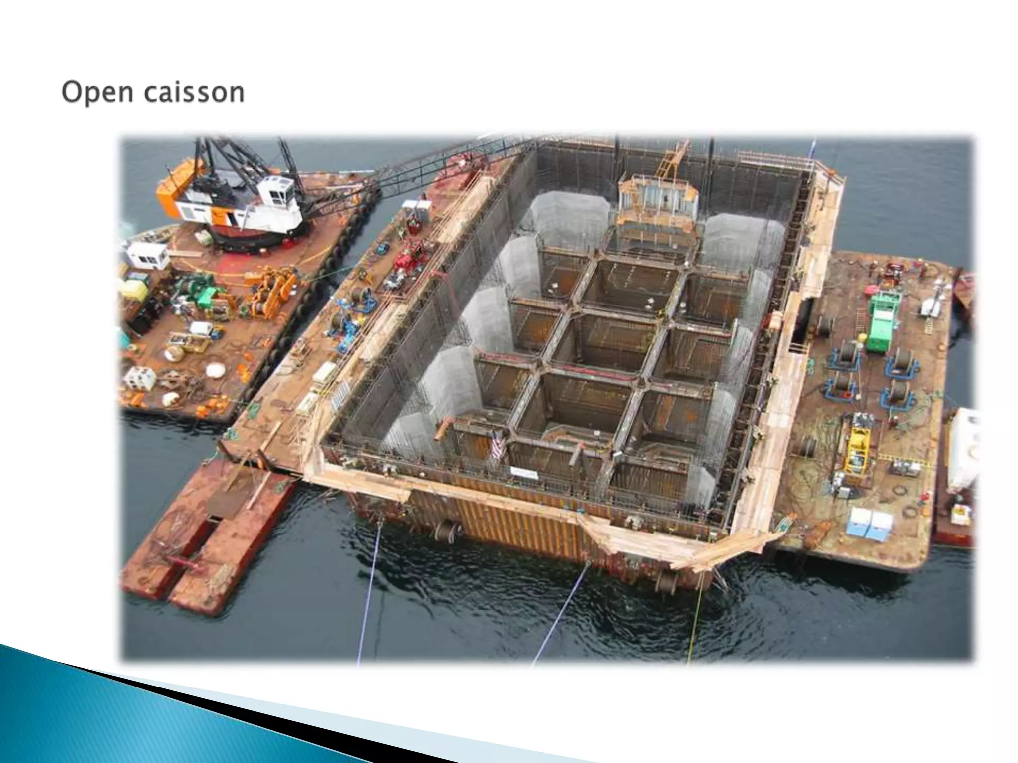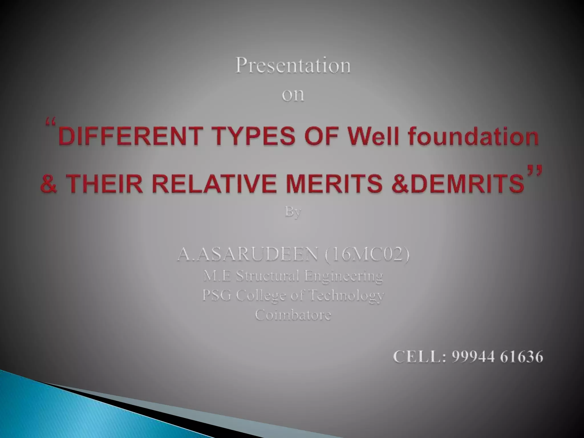 This document discusses different types of well foundations used in India for major bridges. Well foundations are commonly used in India and have been for centuries, with a notable example being the foundations of the Taj Mahal. The document outlines different shapes of well foundations, including circular, double D, twin circular, double octagonal, and rectangular wells. It also discusses open caisson foundations, box caisson foundations, and pneumatic caisson foundations, providing details on their construction methods and advantages and disadvantages.