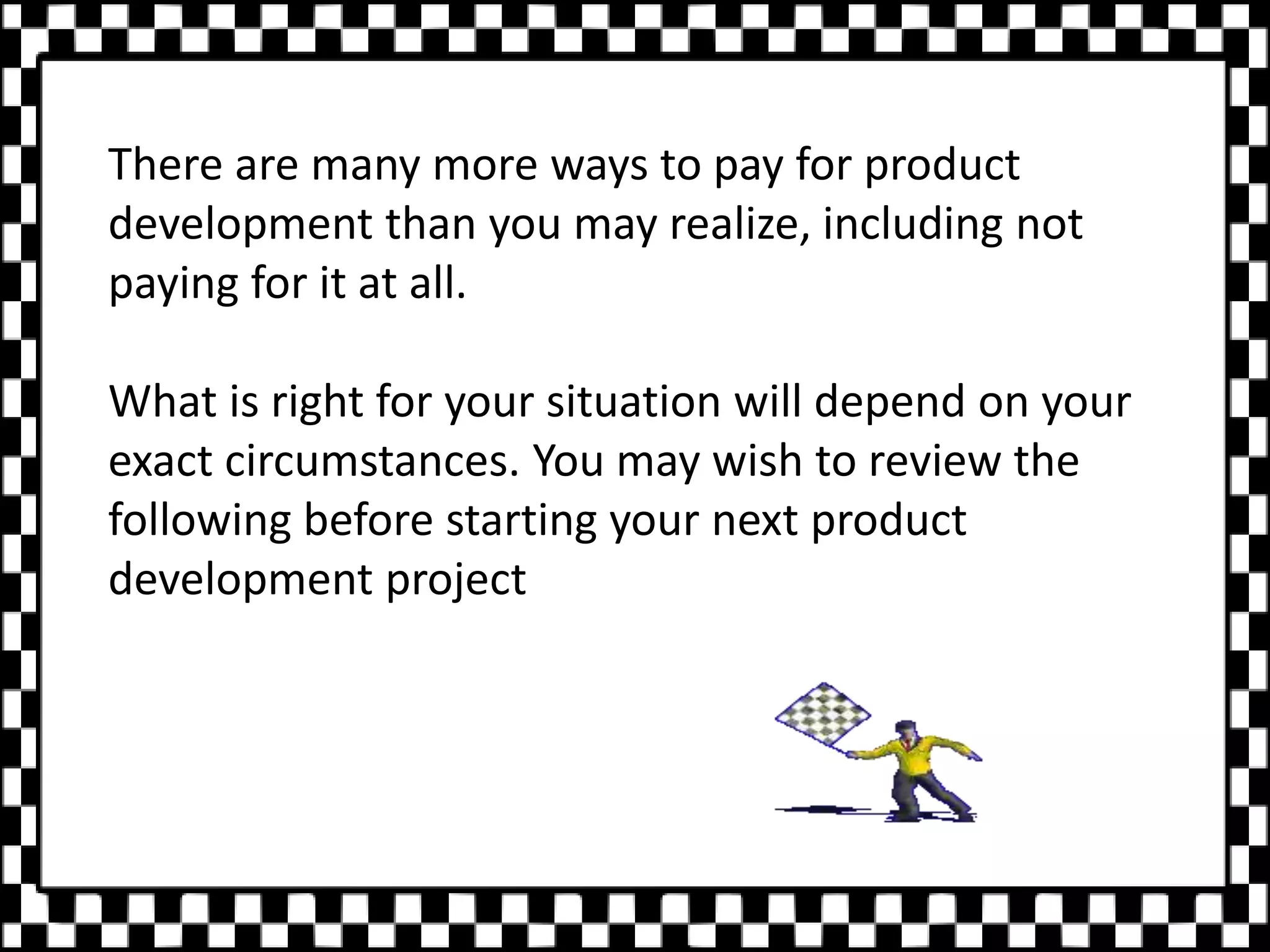 The document outlines various methods for financing product development, highlighting three main approaches: hiring employees, using freelancers, or outsourcing to product development companies (PDCs). It discusses the advantages and challenges associated with each approach, noting that smaller companies often struggle with traditional employment models and may benefit from alternative options like equity exchange or design-and-build contracts. The author emphasizes the need for effective management structures to optimize the use of freelancers and the importance of combining these methods for successful project execution.