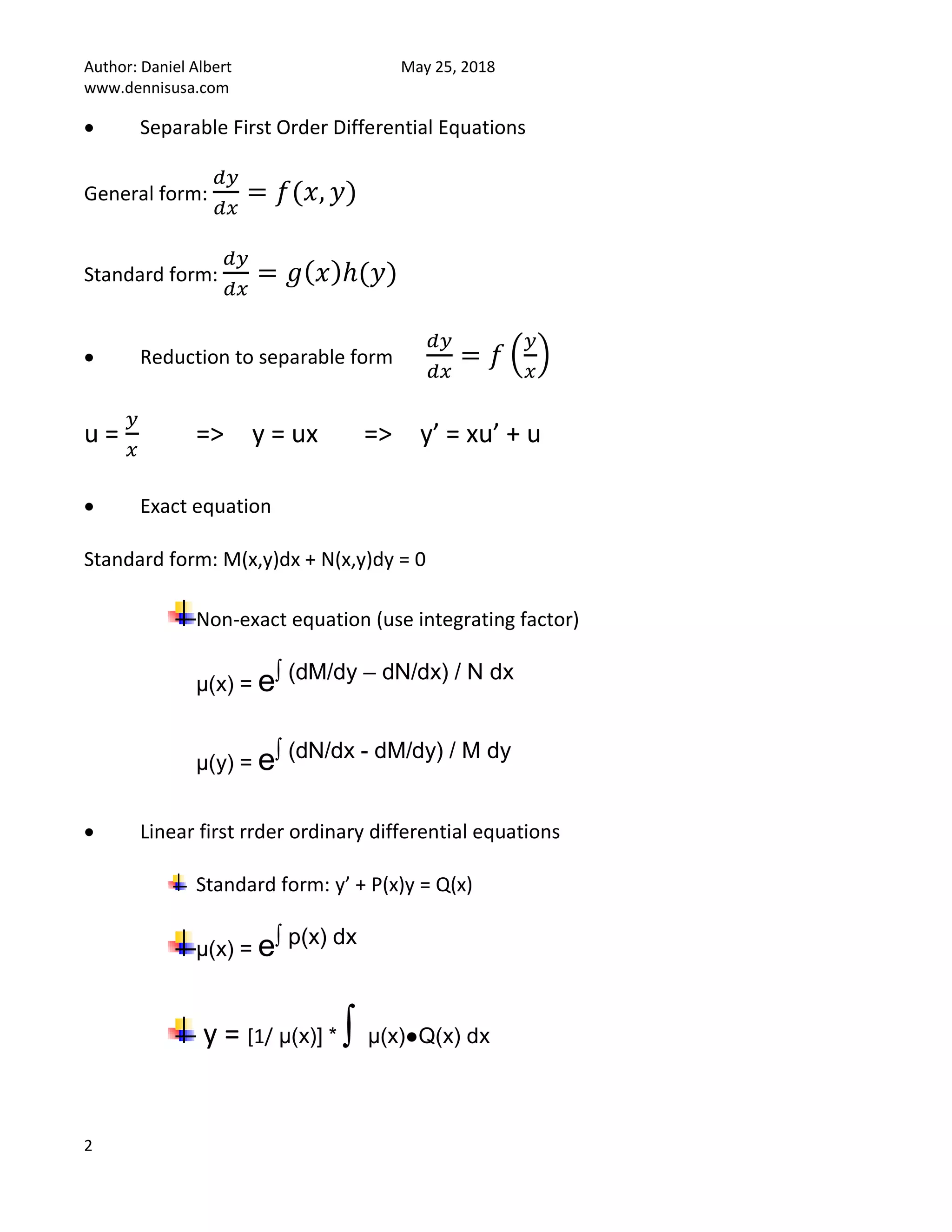 2) Methods for solving first and second order differential equations are discussed, including separation of variables, variation of parameters, undetermined coefficients, and Euler-Cauchy formulas.