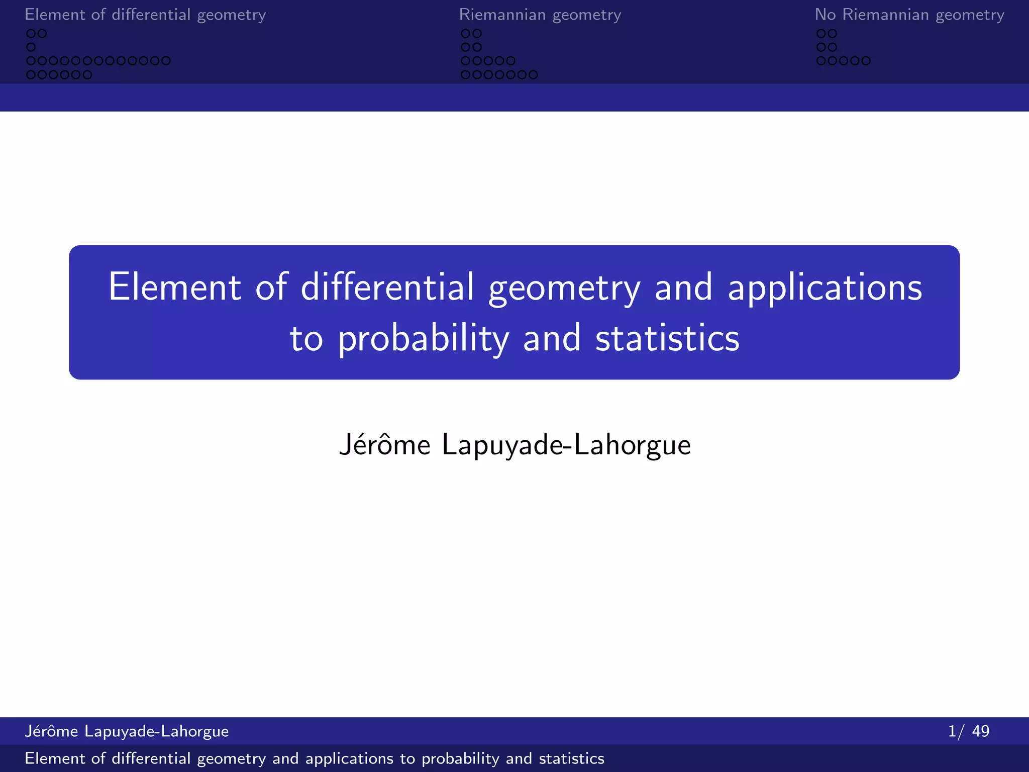 This document provides an introduction to concepts in differential geometry including manifolds, tangent spaces, vector fields, differential forms, and operations on differential forms such as the exterior product and integration. It outlines key definitions and properties for differential geometry, Riemannian geometry, and applications to probability and statistics. The document is divided into three main sections on differential geometry, Riemannian geometry, and settings without Riemannian geometry.