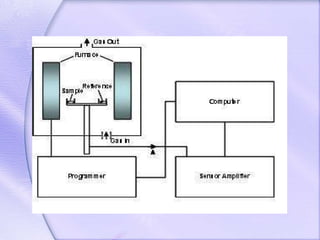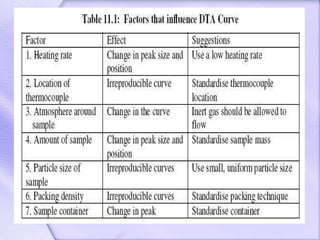 Differential thermal analysis (DTA) is a thermal analysis technique that measures the temperature difference between a sample and an inert reference material as they are heated or cooled. DTA can detect physical or chemical changes in a sample as they occur, such as fusion, crystallization, oxidation, or decomposition. Changes are detected based on the temperature difference that develops between the sample and reference material. DTA provides a characteristic "fingerprint" curve for a sample that can be used to identify materials. Common applications of DTA include quantitative identification and purity assessment of materials.
