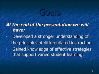 This document discusses the principles of differentiated instruction. It defines differentiated instruction as a flexible teaching approach that adjusts the curriculum and instruction to meet the individual needs of students. The goals of differentiated instruction are to provide access to learning, increase student motivation and learning efficiency by recognizing differences in student backgrounds, readiness levels, interests and learning preferences. Effective strategies for differentiated instruction include ongoing assessment, clear learning goals, flexible grouping of students, and ensuring an appropriate level of challenge through respectful tasks.