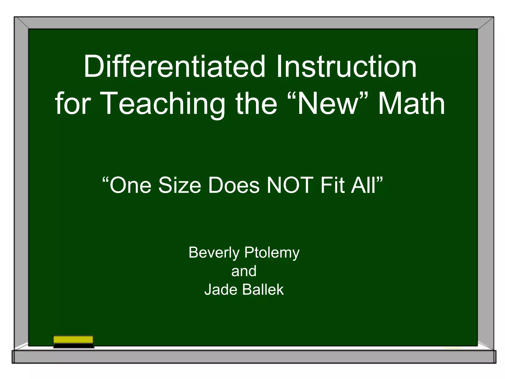 This document discusses differentiated instruction strategies for teaching math. It defines differentiated instruction as proactively planning to meet diverse student needs by focusing on learning outcomes and adjusting the content, process, or product based on student readiness, interests, and learning profiles. Examples of strategies discussed include using learning stations, the anticipation guide pre-assessment technique, and determining student learning styles. The "new math" approach emphasizes exploring problems, reflecting on different strategies, and having students explain their reasoning over traditionally teaching a single procedure.