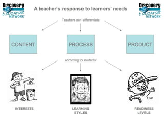 This document provides tips for differentiating instruction using Discovery Education resources. Teachers can search DE streaming content by subject, grade level, and state standards. Media assets include videos, images, audio speeches with transcripts, and encyclopedia articles. Teachers can create assignments, quizzes, and writing prompts and assign them to students through the DE Student Center. Students can access assigned content and track their progress. DE streaming content can be downloaded and incorporated into projects in programs like Photostory, Movie Maker, Glogster, and podcasts to demonstrate student learning.