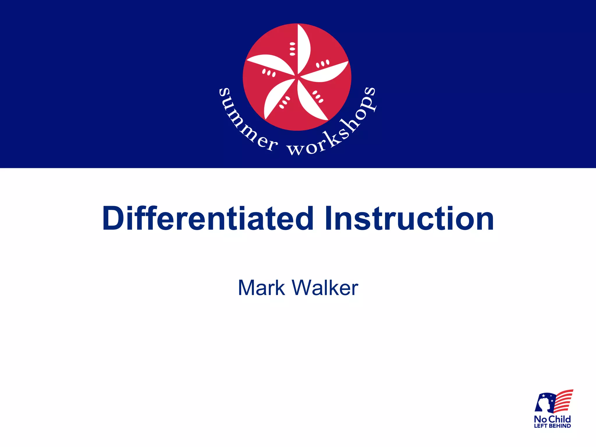 The document discusses differentiated instruction, which is a teaching approach that recognizes students learn in different ways and at different paces. It involves modifying instruction based on student needs using various techniques like flexible grouping, tiered lessons, and choice boards. Key aspects of differentiated classrooms include assessing student needs, providing multiple options for content, process and product, and creating an environment where students feel challenged but supported in their learning. The goal is to maximize each student's growth by meeting them where they are.