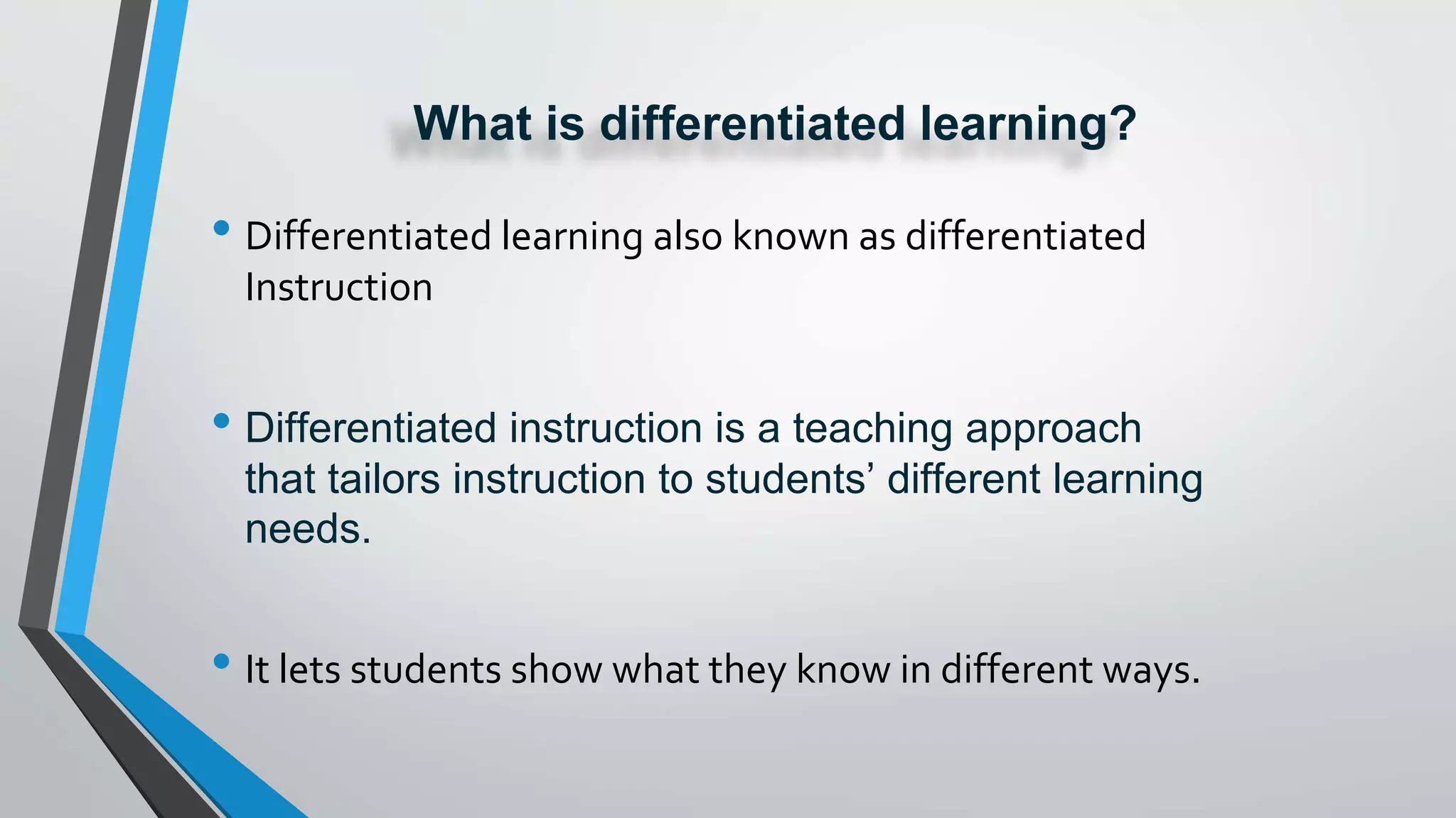 Differentiated learning, also known as differentiated instruction, is a teaching approach that tailors instruction to meet individual student needs. It allows students to show what they have learned in different ways. There are four main ways to differentiate: content, process, product, and learning environment. Teachers can differentiate by adjusting activities, materials, lessons, and assessments based on a student's readiness, interests, and preferred mode of learning. The goal is to develop engaging tasks that challenge and enhance learning for each student. While research shows differentiated instruction is effective, it also requires more planning time from teachers.