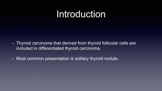 Differentiated thyroid cancer includes papillary, follicular, and Hurthle cell carcinomas which arise from thyroid follicular cells. Papillary thyroid carcinoma is the most common type, accounting for 80-85% of cases. It typically presents as a slow-growing solitary thyroid nodule and has an excellent prognosis with a 95% 10-year survival rate. Surgical treatment may include total thyroidectomy followed by radioactive iodine (RAI) therapy in high-risk cases. Long-term monitoring involves measuring serum thyroglobulin and ultrasound imaging of the neck. Localized recurrence is typically treated with surgery while metastatic disease is managed with additional RAI if radioiodine avid or other modalities if not