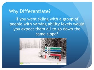 Differentiated instruction is an approach to teaching that acknowledges students learn in different ways and at different paces. It involves providing multiple means of engagement, representation, and expression based on students' individual readiness levels, interests, and learning profiles so that all students can achieve the same learning goals. Differentiated instruction aims to create a classroom environment that meets the needs of all students, including those who are advanced, struggling, or average, just as skiers of varying abilities take different paths down the mountain to successfully reach the bottom.