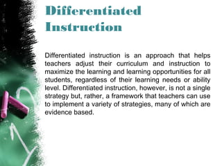Differentiated instruction is a teaching framework that enables educators to modify their curriculum and instructional strategies to meet diverse learning needs and abilities of students. It includes various strategies such as choice boards, flexible grouping, tiered assignments, and effective classroom management. The goal is to enhance student engagement and understanding by allowing for personalized learning experiences.