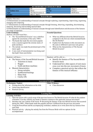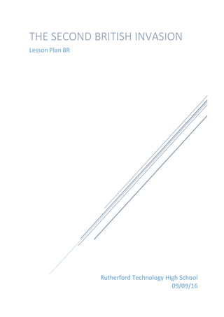 The lesson plan discusses the Second British Invasion of the 1980s. It occurred as a transition away from punk, funk, and disco. Reggae became popular through few specialist bands. New bands used synthesizers and drum machines in their melodic, dance-inspired music with catchy riffs. Artists like Dire Straits, Wham, Culture Club, and The Police rose to fame through MTV and helped popularize the new romantic style of dressed effeminately. The lesson includes a listening activity on Culture Club and a practical activity playing the melody from "The Princess Bride" with chord accompaniment choices.