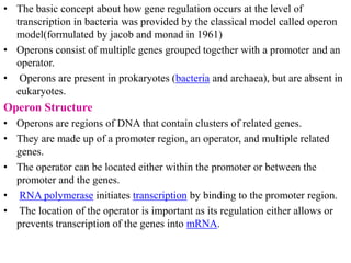 The document discusses the operon model, which explains gene regulation at the transcription level in prokaryotes, specifically focusing on the lac and galactose operons. It details the components and functions of these operons, including how they respond to the presence of sugars like glucose and lactose and the mechanisms of negative and positive control of transcription. Additionally, it describes the trp operon, which is involved in tryptophan biosynthesis, highlighting how its expression is regulated based on the availability of tryptophan in the environment.