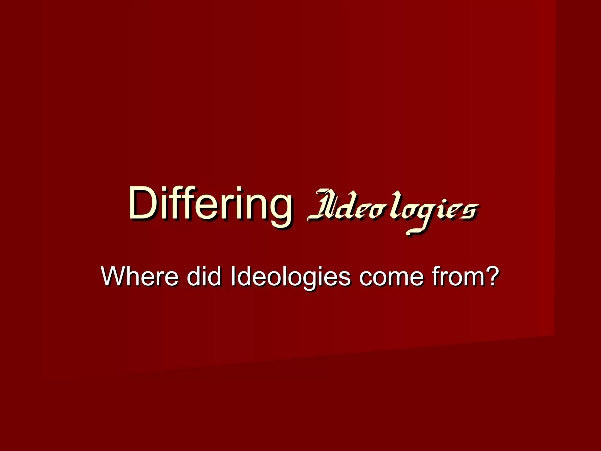 The document discusses differing ideologies around government that emerged during the Enlightenment period in Europe. It profiles several influential philosophers from this era and their beliefs, including Thomas Hobbes who argued for absolute rule to maintain order, John Locke who believed in natural rights and popular consent of government, Voltaire who hoped for an enlightened monarch, Rousseau who felt people were equal and society should serve the general will, and Montesquieu who believed in separating government powers with checks and balances.
