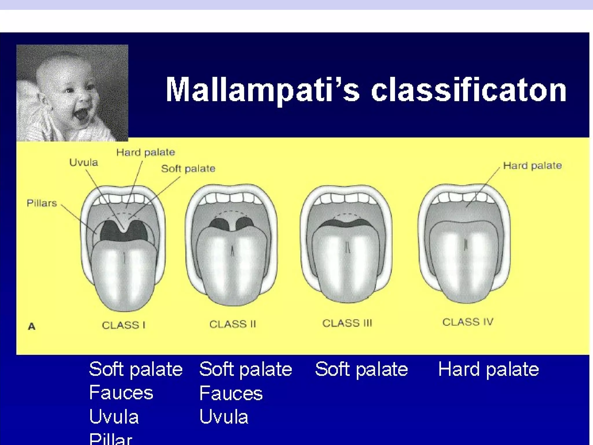 MALLAMPATI TEST Patientin sitting position Head in neutral position Maximal tongue protrusion No phonation SAMPSOON-YOUNG’S MODIFICATION ( 1987 ) added Class IV and correlated b/w ability to observe intraoral strucures and incidence of subsequent difficult intubations. Visualisation of any part of epiglottis during MMP test Associated with easy laryngoscopy Difficult airway possible large epiglottis hinder laryngoscopic view as well as ventilation CLASS ZERO MALLAMPATI