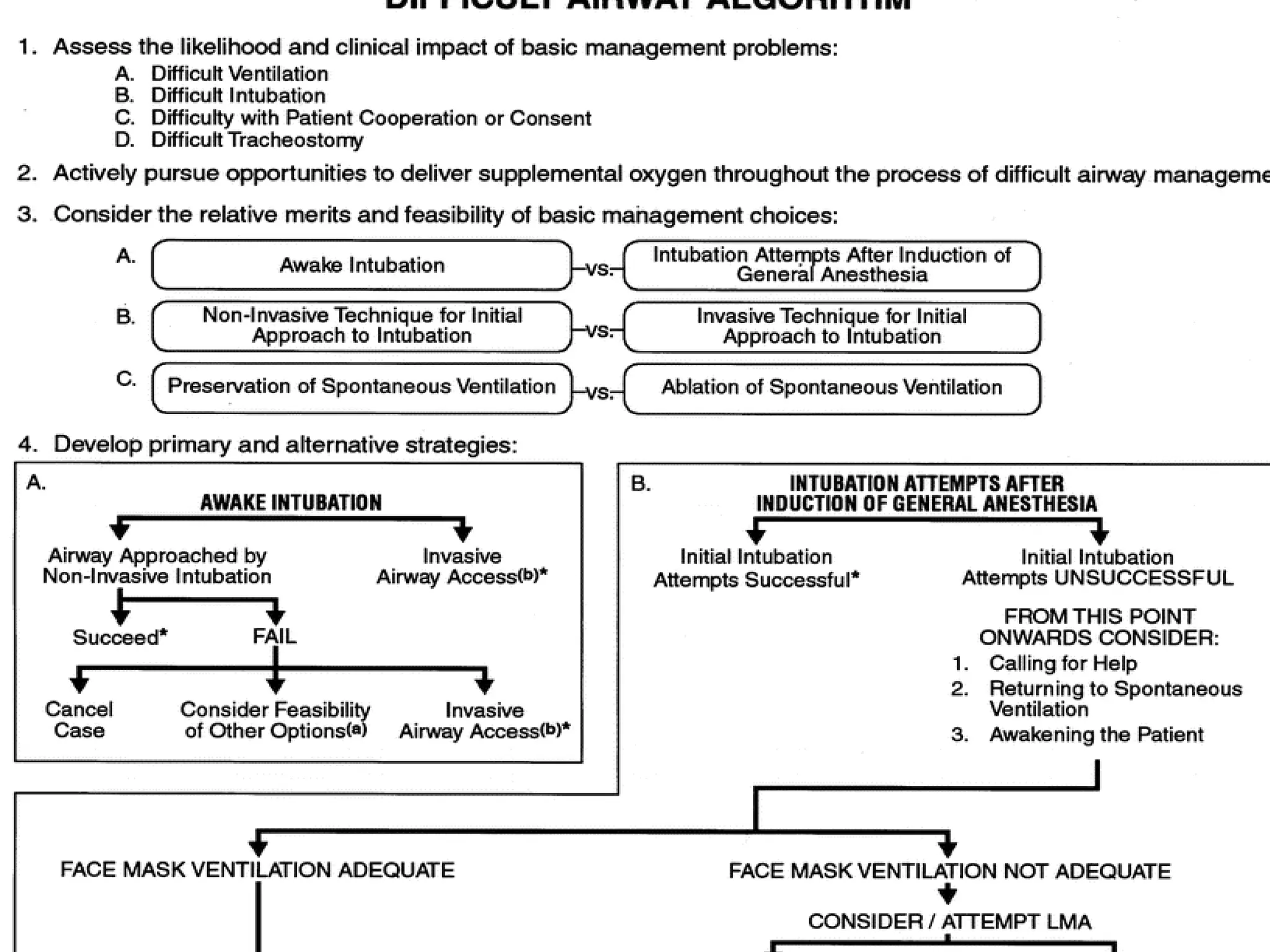 ASA TASK FORCEON MANAGEMENT OF DIFFICULT AIRWAY Basic preparation Inform Ascertain help Preoxygenation Supplemental oxygenation throughout Portable storage unit Rigid laryngoscope blades ETTs ETT guides/bougie LMAs FOI equipments Retrograde intubation kit Emergency non invasive airway ventilation device. Emergency invasive airway access Exhaled CO2 detector