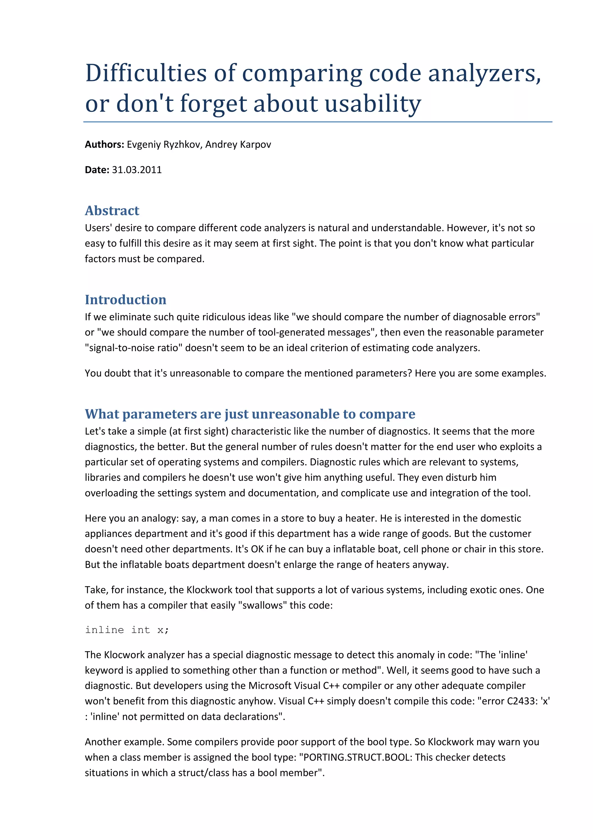 Comparing code analyzers is challenging due to the complexity of relevant parameters and usability factors. Merely counting diagnostic rules is misleading, as it does not reflect the true utility for end users, who require specific diagnostics based on their systems. Ultimately, the effectiveness of a code analyzer depends on its usability and how well it meets the specific needs of the project and user.