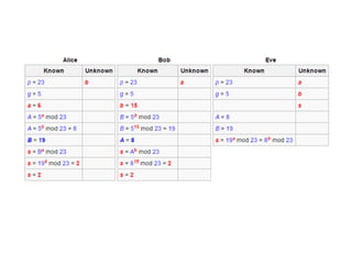 Diffie-Hellman key exchange is a cryptographic protocol that allows two parties to establish a shared secret over an unsecured communication channel. It was one of the first practical examples of key exchange and predates public-key infrastructure. The security of the Diffie-Hellman protocol relies on the difficulty of calculating discrete logarithms, though it lacks authentication and is susceptible to man-in-the-middle attacks. While an important historical algorithm, Diffie-Hellman may not scale sufficiently for future needs as key sizes would need to continually increase over time to maintain security levels.