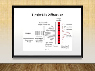 1. The document discusses the phenomenon of diffraction, where light waves bend and spread out when passing through narrow openings or obstacles.