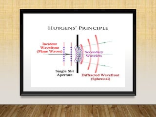 2. It describes how Huygen's principle explains that each point on a wavefront acts as a secondary source of waves, and the combination of these secondary waves causes diffraction patterns of alternating bright and dark fringes.