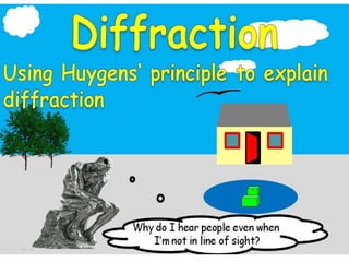 2. There are two main types of diffraction: Fresnel diffraction occurs when light passes near an obstacle, while Fraunhofer diffraction occurs when light passes through or around objects and the observation is made far from the obstacle.