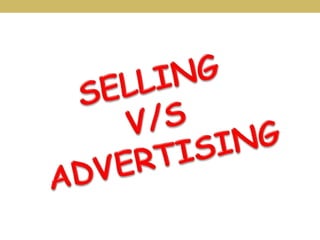 Advertising is a paid, non-personal form of promotion using mass media to communicate a message to a large audience, while selling involves direct, two-way communication between a seller and buyer where a transaction takes place. Key differences are that advertising allows reaching many people quickly at low cost but with limited information, while selling allows more tailored, flexible interactions but has higher per-contact costs and reaches fewer people. Both play important but different roles in product promotion and distribution.