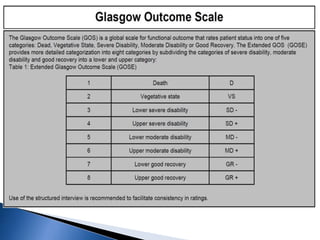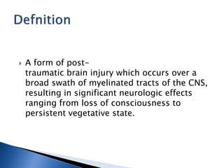 This document discusses diffuse axonal injury (DAI), a type of traumatic brain injury caused by shearing and tearing of axons. It occurs in about 50% of severe head injuries and can lead to loss of consciousness or a persistent vegetative state. The document outlines the pathogenesis and grading of DAI, as well as management strategies to prevent secondary brain injury like intracranial hypertension. Monitoring tools like intracranial pressure (ICP) measurement and multimodality monitoring are important for evaluation and guiding treatment.