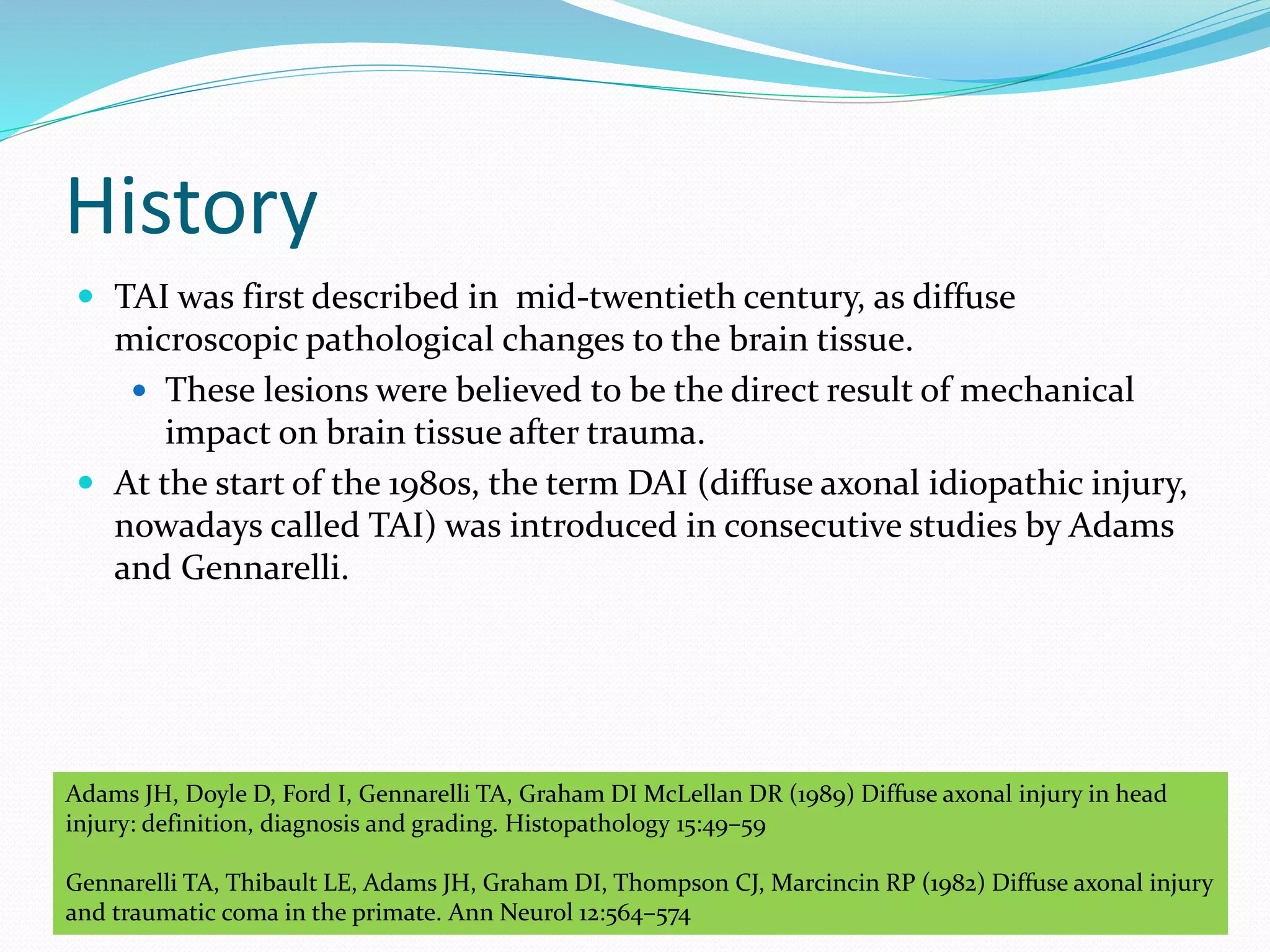 The document discusses the history, pathophysiology, diagnosis, and treatment of traumatic axonal injury (TAI). TAI was first described in the mid-20th century and involves microscopic lesions in brain tissue resulting from mechanical impact. It involves both primary damage from the initial impact as well as secondary damage from chemical and metabolic changes. Diagnosis involves imaging like CT, MRI, and DTI to identify lesions in white matter tracts. Currently there is no specific treatment for TAI, but care focuses on stabilizing the patient and preventing increases in intracranial pressure to limit secondary damage.