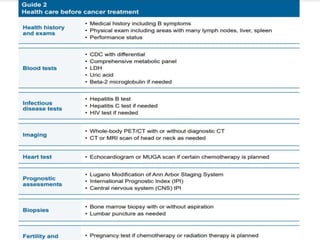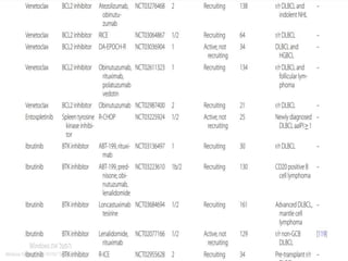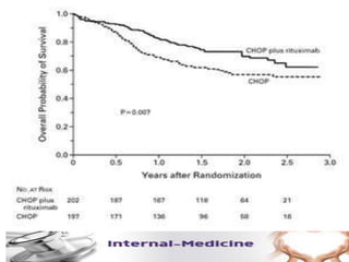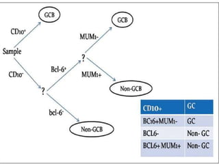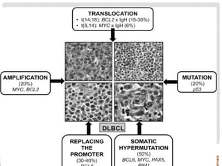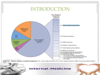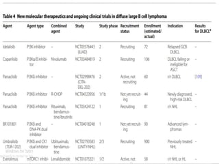 This document provides an overview of diffuse large B-cell lymphoma (DLBCL), including epidemiology, risk factors, presentation, histology, genetics, therapy, and treatment options. DLBCL is the most common subtype of non-Hodgkin lymphoma. The standard first-line treatment is rituximab combined with cyclophosphamide, doxorubicin, vincristine, and prednisone (R-CHOP). For early stage disease, options include full chemotherapy or abbreviated chemotherapy with radiation. Advanced disease is treated with full chemotherapy. Refractory cases may be treated with newer agents or CAR T-cell therapy.