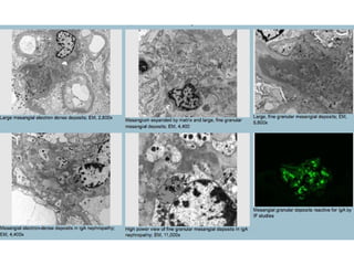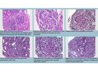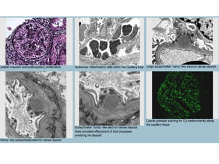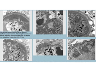 Diffuse proliferative glomerulonephritis (GN) involves over 50% of glomeruli showing endocapillary or extracapillary proliferation. It is commonly seen in immune complex diseases like lupus nephritis and post-infectious GN. Histopathology shows proliferative changes, neutrophils, cellular crescents in some glomeruli, and C3-dominant immune complex deposition. Electron microscopy reveals foot process effacement, thickened basement membranes, and subepithelial immune complex deposits. Lupus nephritis class IV has similar features but with full house immune complex deposition and possible membranoproliferative changes. IgA nephropathy shows mes