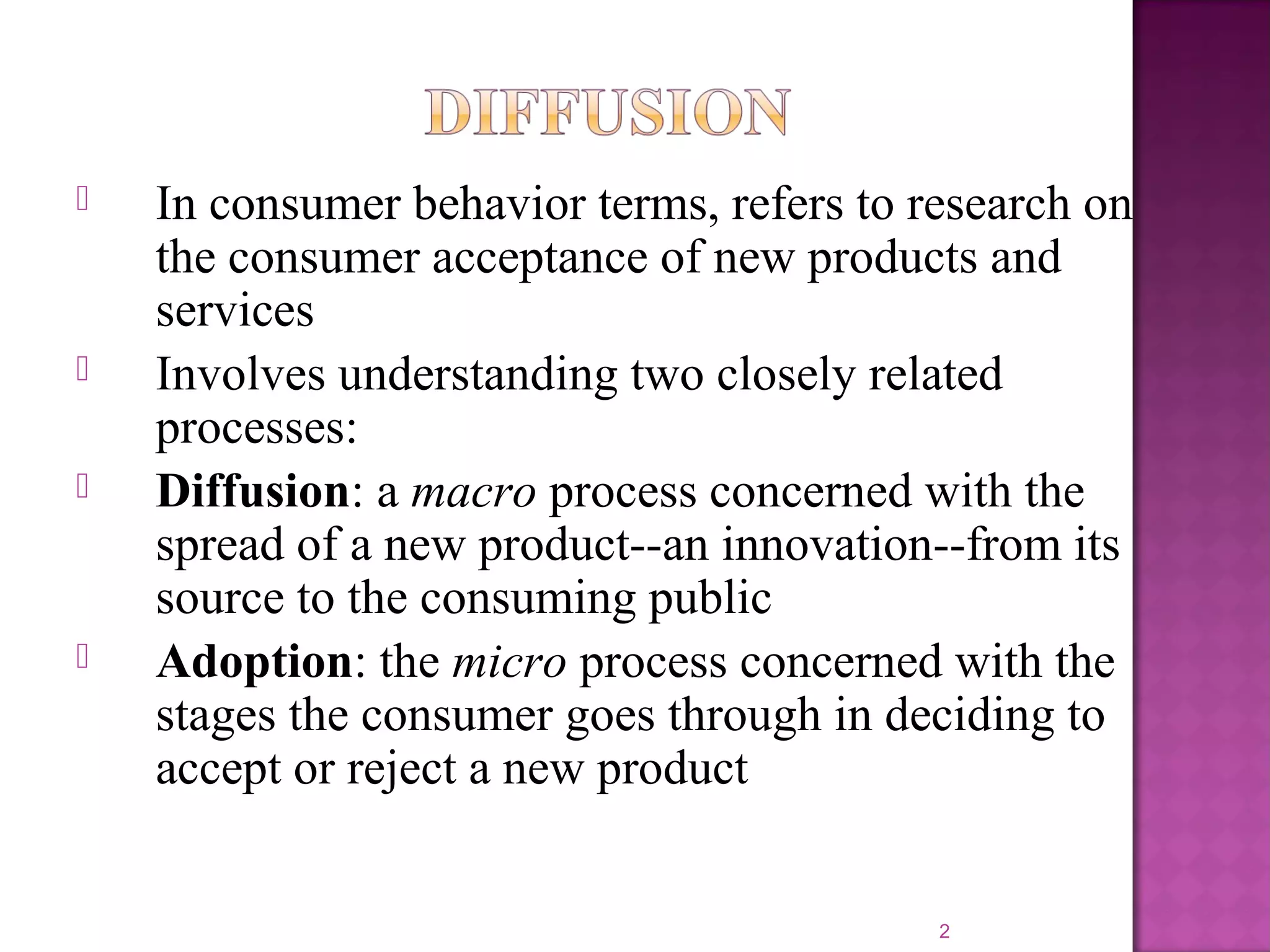 This document discusses the diffusion of innovations, which refers to how new products, services, ideas or practices are adopted by consumers over time through communication channels. There are two key processes involved - diffusion, which is the spread of an innovation from its source to the public, and adoption, which involves the stages consumers go through in deciding whether to accept or reject an innovation. The rate of adoption depends on factors like an innovation's relative advantage, compatibility, complexity, trialability and observability. The document outlines the innovation adoption process and categories of adopters from innovators to laggards.