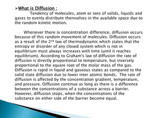 This document discusses diffusion in solids. It defines diffusion as the tendency of molecules, atoms, or ions to distribute evenly in space due to random kinetic motion. Diffusion occurs due to concentration gradients and stops when concentrations equalize. In solids, diffusion results from thermally-activated random atomic motion. There are two mechanisms - interstitial, where small atoms fit between others, and vacancy, where atoms jump into vacant sites. Examples given are carbon diffusion in steel via the interstitial mechanism, salt dissolving in water as a solid-liquid diffusion example, and dust particles suspended in air as a solid-gas diffusion example.
