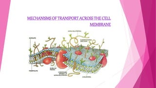 The document summarizes the main mechanisms of transport across the cell membrane: passive transport and active transport. Passive transport includes osmosis, simple diffusion, and facilitated diffusion, and does not require energy. Active transport requires the cell to use energy to move molecules against a concentration gradient. The document also describes types of solutions (hypotonic, hypertonic, isotonic) and how they affect cell volume. Diffusion is defined as the net movement of substances from an area of high concentration to low concentration down a concentration gradient.