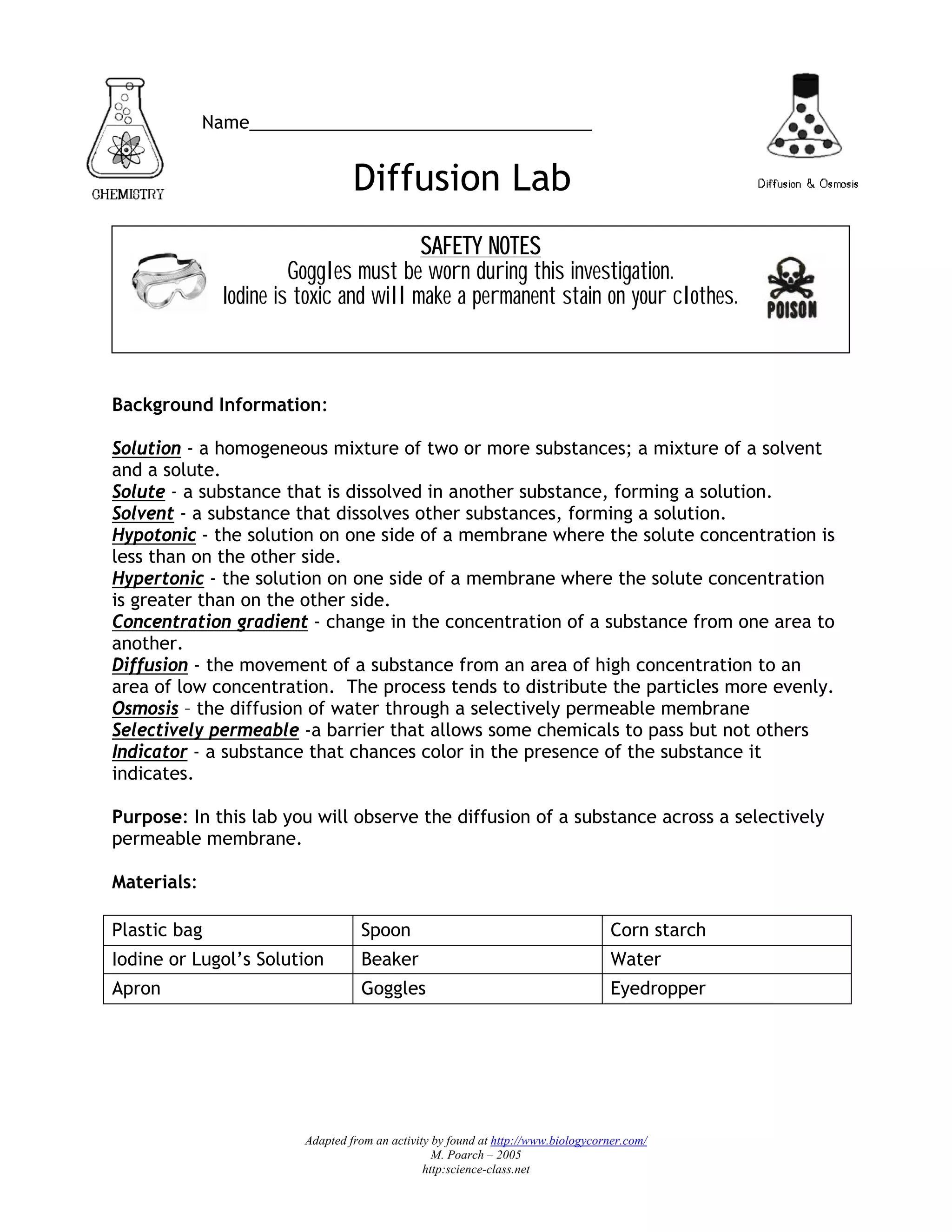 This document describes a diffusion experiment using a plastic bag, cornstarch, iodine solution, and water. Students observe as iodine diffuses through the selectively permeable plastic bag membrane into the cornstarch solution. Safety goggles must be worn as iodine can stain clothes. The purpose is to observe diffusion across a membrane as evidenced by a color change. Students record observations and answer analysis and prediction questions about diffusion and the experiment.