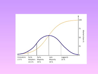 Diffusion of Innovation theory examines how, why, and the rate at which new ideas and technologies spread through cultures over time. The key aspects of the theory include the innovation, communication channels, time, and the social system. Adoption of innovations follows an S-curve as they are first adopted by innovators, early adopters, early majority, late majority, and laggards. Factors like relative advantage, compatibility, complexity, trialability, and observability influence adoption rates.