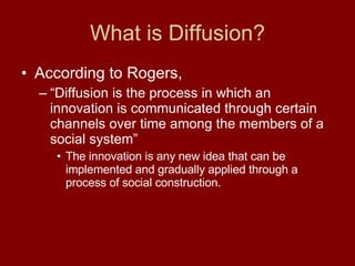 Diffusion of innovation refers to the process by which an innovation is communicated over time among members of a social system. The key elements are the innovation itself, communication channels, time, and the social system. Change agents play an important role in introducing innovations and guiding their adoption through a systematic process involving knowledge, persuasion, decision, implementation, and confirmation. Adoption occurs gradually as different members of a social system choose to adopt the innovation at different times.