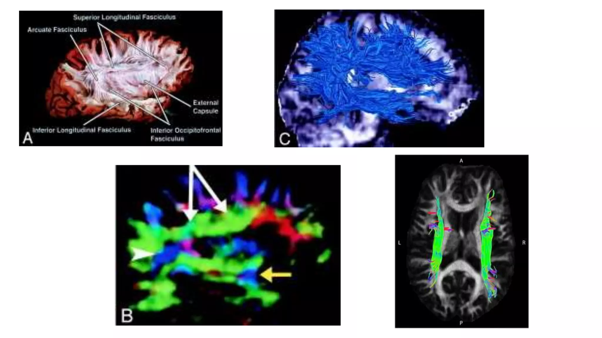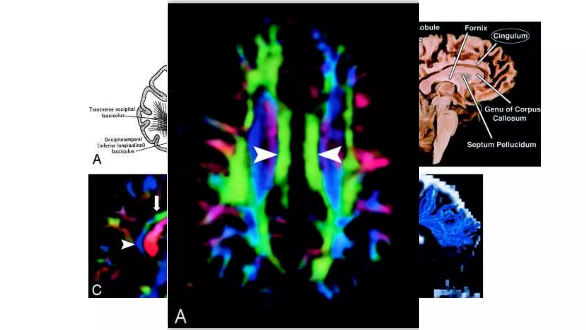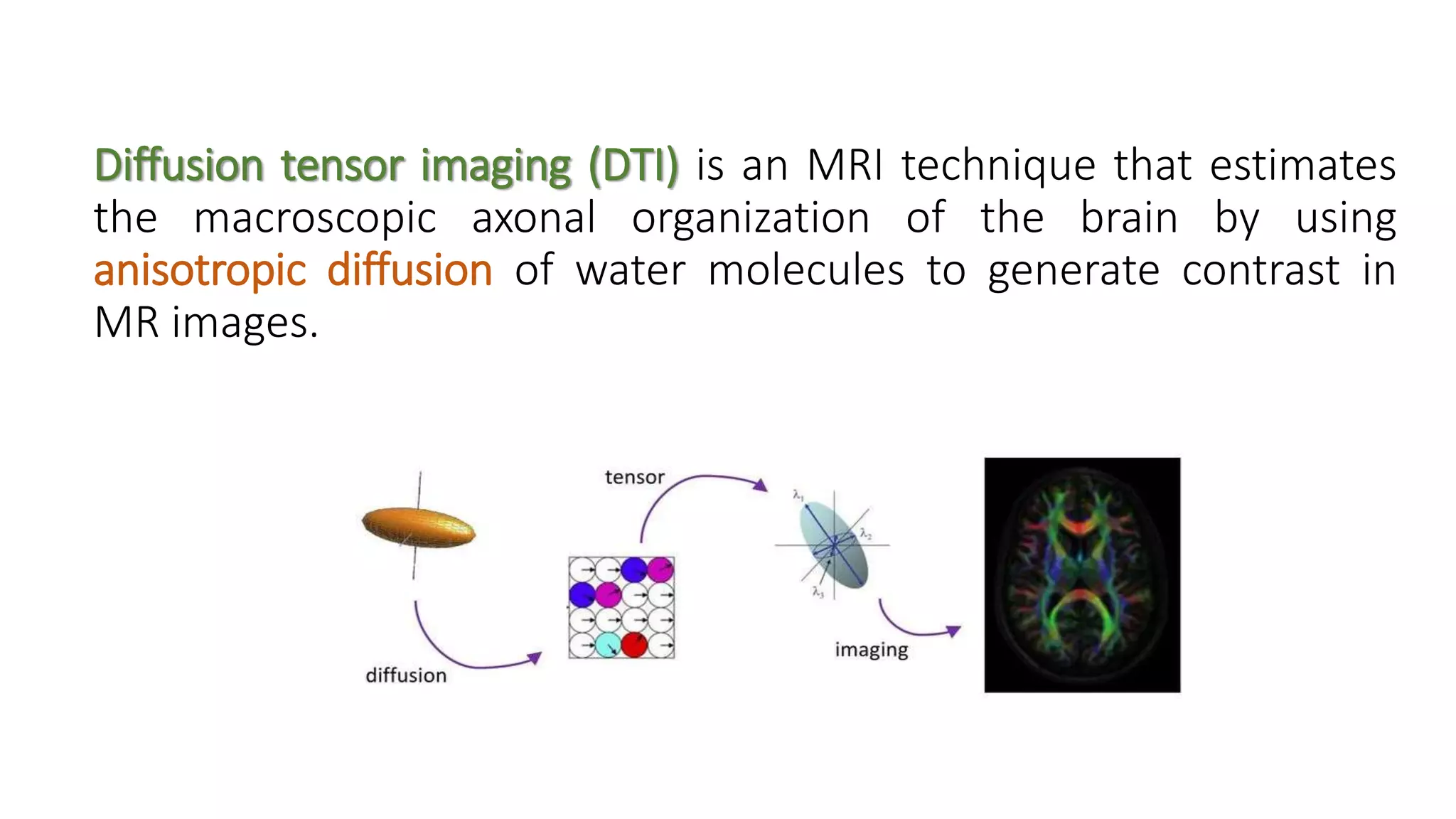 Diffusion tensor imaging (DTI) is an MRI technique that uses the diffusion of water molecules to generate contrast in MR images and estimate the macroscopic organization of axonal fibers in the brain. DTI collects data that is used in MR tractography, a 3D reconstruction technique to visualize and assess white matter tracts. DTI is able to detect anisotropic diffusion, where water diffusion has a preferred direction, in white matter tracts compared to isotropic diffusion where water moves randomly in all directions. Various DTI metrics like fractional anisotropy and tractography maps are used to visualize white matter tract orientation and connectivity in the brain.