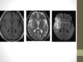 This document discusses diffusion weighted imaging (DWI) and its application in evaluating brain pathologies. It provides details on how DWI works using diffusion gradients and endogenous contrast from water motion. Areas of restricted diffusion like cytotoxic edema appear brighter on DWI. DWI is highly sensitive for detecting acute ischemia within minutes. It is useful for distinguishing acute from subacute lesions based on apparent diffusion coefficient (ADC) maps. DWI also has applications in evaluating other conditions like abscesses, tumors, infections and injuries.