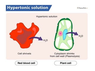 This document provides an overview of diffusion and osmosis in plants. It defines diffusion as the movement of molecules from an area of higher concentration to lower concentration, which can occur actively through external energy or passively without energy. Osmosis is defined as the diffusion of water across a semi-permeable membrane from an area of lower solute concentration to higher. The document outlines the factors that affect diffusion and osmosis rates, the different types of osmosis, and the importance of these processes for water and mineral absorption and transport in plants. Measurement techniques for water potential and status are also discussed.