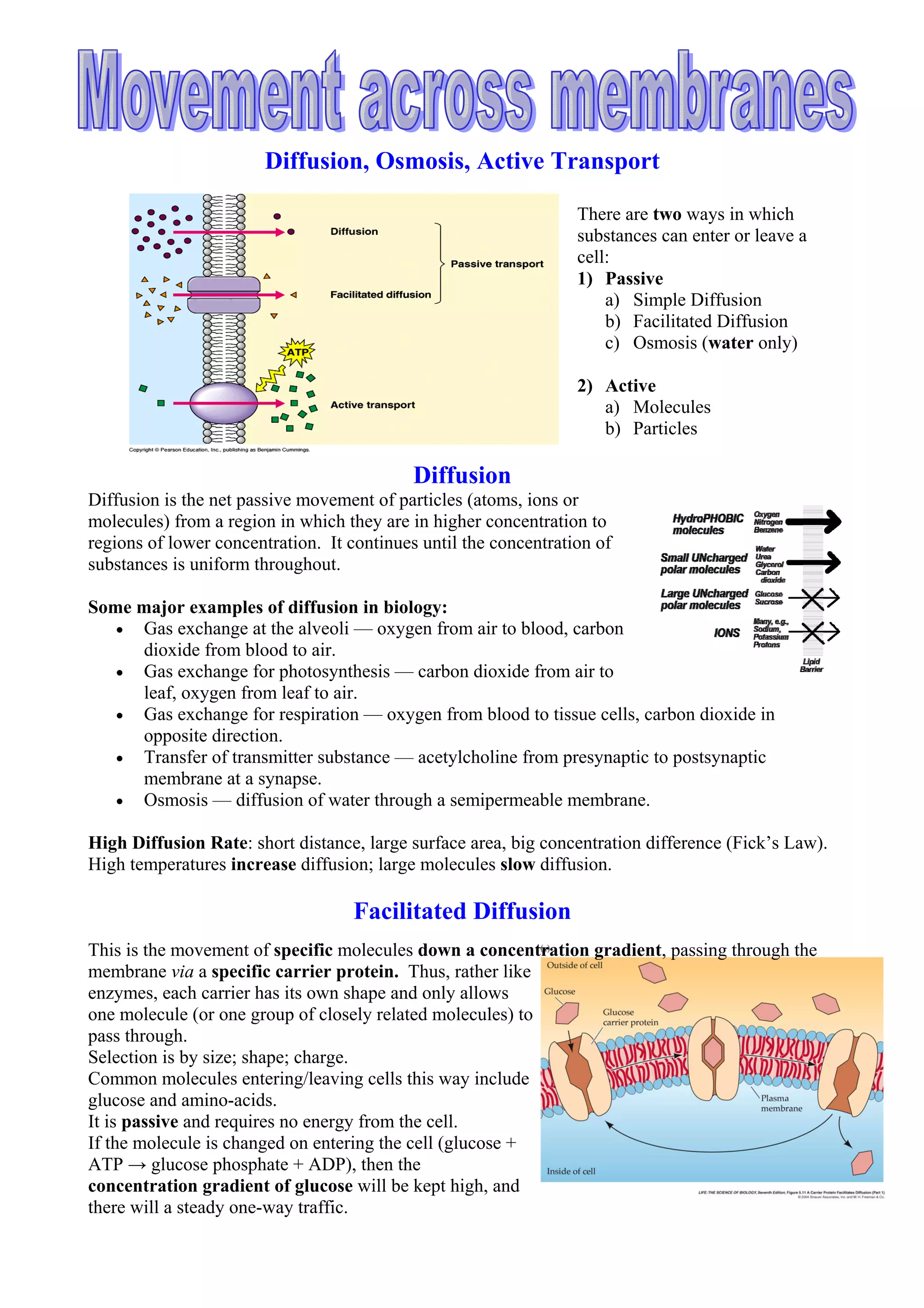 There are two ways for substances to enter or leave a cell: passive diffusion (simple/facilitated diffusion, osmosis) and active transport. Passive processes involve movement down a concentration gradient without energy usage, while active transport moves substances against a gradient by using ATP. Osmosis is diffusion of water through a semi-permeable membrane, and turgor pressure results from water uptake in plant cells. Active transport uses protein carriers and ATP to move molecules against their gradients.