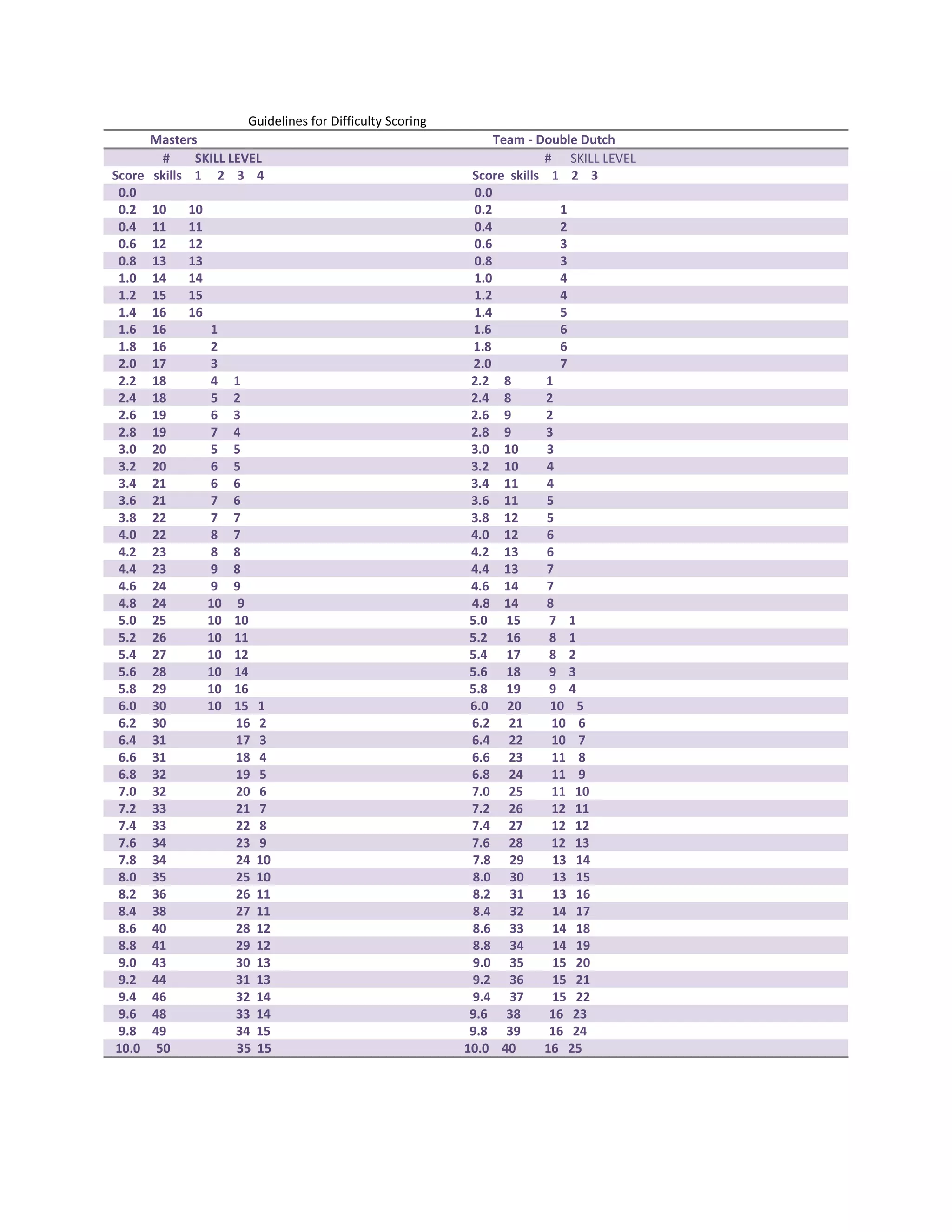 The document provides guidelines for scoring the difficulty of double dutch jumping routines for both individual masters and teams. It assigns point values from 0.0 to 10.0 based on the number and difficulty of skills performed, with higher scores indicating more advanced routines requiring a greater number of increasingly difficult skills.