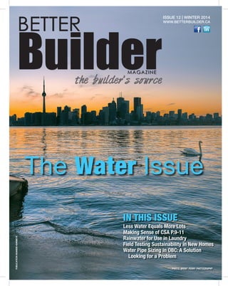 This issue of Better Builder Magazine focuses on water conservation and management, emphasizing the importance of efficient water use in sustainable building practices. Articles cover various topics, including greywater recycling, rainwater usage, and advancements in water-efficient technologies aligned with the Ontario Building Code. The publication highlights initiatives like York Region's Sustainable Home Incentive Program to encourage water-saving construction practices while addressing the financial and environmental impacts of water consumption.