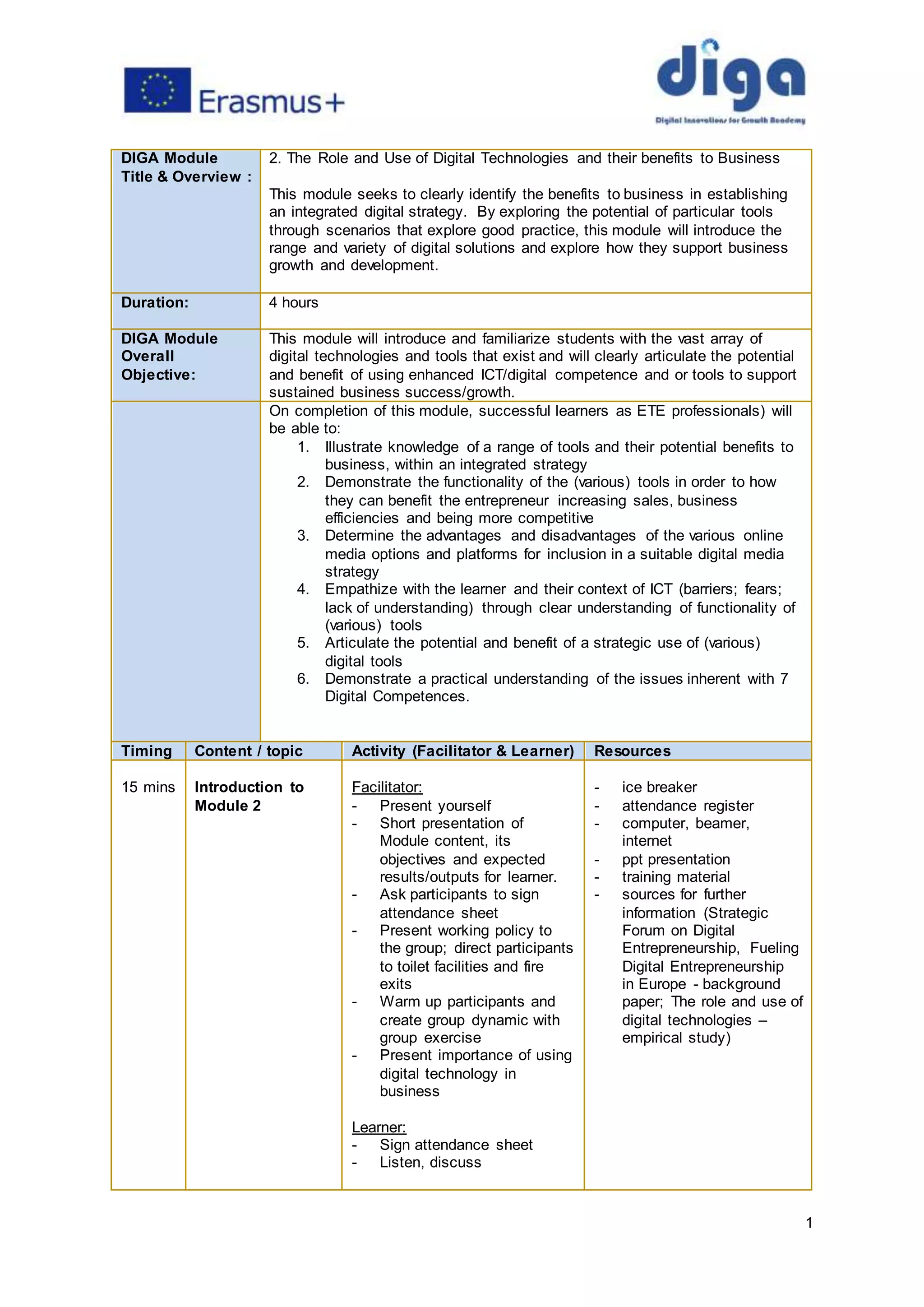 This 4-hour module seeks to introduce students to the range of digital technologies and tools that exist and their potential benefits to business. It will cover key concepts such as the 6 main business functions and how digital tools can support each. Activities will include identifying tools and their benefits, and discussing barriers to tool adoption. The module aims to illustrate how tools can benefit businesses through increased sales, efficiencies and competitiveness when integrated into a digital strategy. Assessment will be via online questionnaires testing students' understanding of tools, functionality, advantages/disadvantages, and digital competencies.