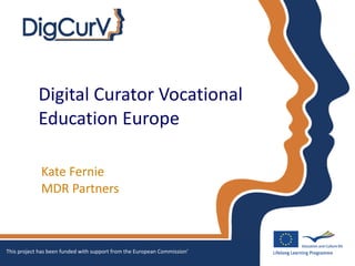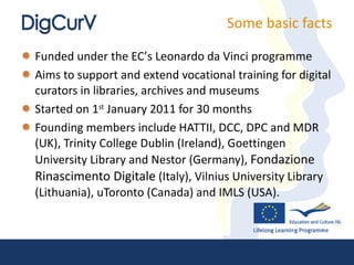 The project, funded by the European Commission under the Leonardo da Vinci programme, aims to enhance vocational training for digital curators across Europe by analyzing existing training opportunities, surveying training needs, and establishing an initial curriculum. It involves multiple founding members from various countries and addresses the skills required in digital preservation within cultural institutions. An ongoing survey seeks to map current training offerings and will be complemented by a survey assessing the specific training needs of cultural institutions.
